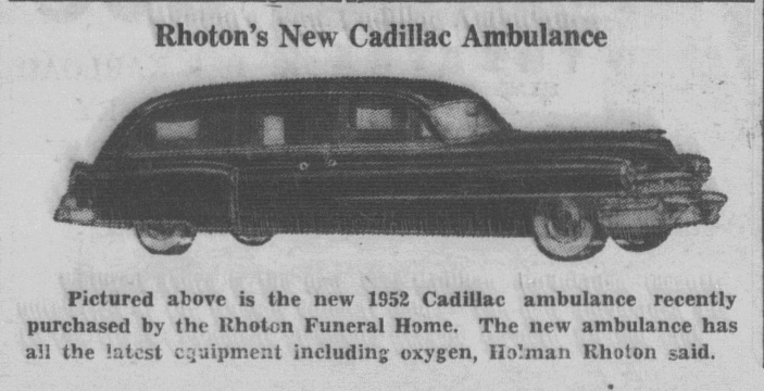 1952 Cadillac Ambulance - Rhoton's Funeral Home Advertisement from the Carrollton Chronicle, May 23, 1952