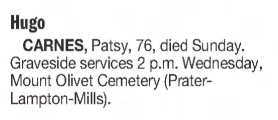 CARNES, Patsy, 76, died Sunday. Graveside services 2 p.m. Wednesday, Mount