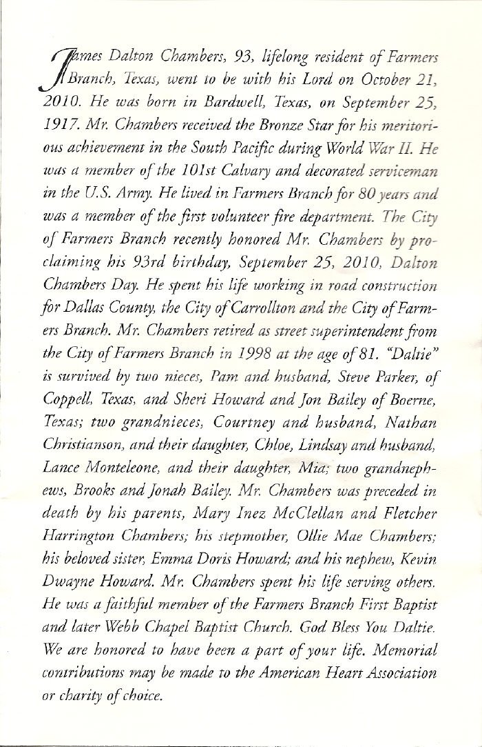 September 25, 1917. Mr. Chambers received the Bronze Star for his