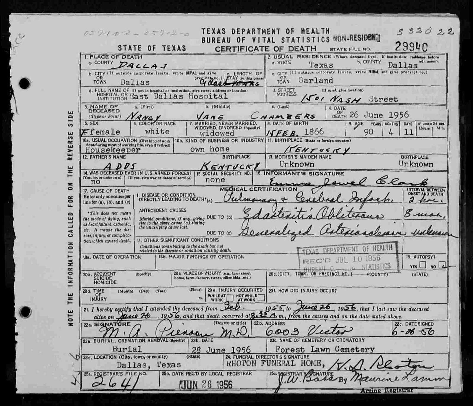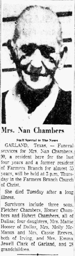 GARLAND, Texas - Funeral services for Mrs. Nan Chambers, 90, a resident