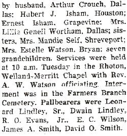 Survived by husband Arthur Crouch, Dallas; Hubert J. Isham. Grapevine; Mrs.