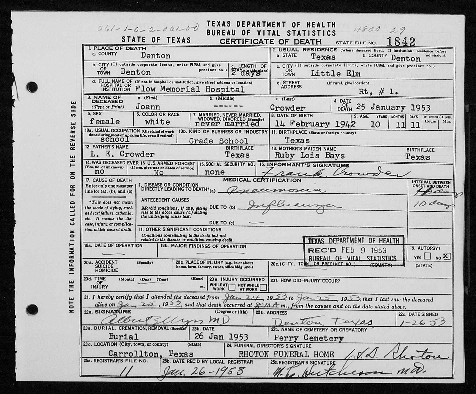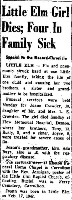 Mrs. L. E. Crowder. The girl died Sunday at Flow Memorial Hospital, Denton,