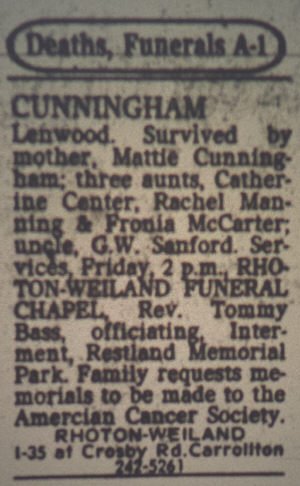 Lenwood. Survived by mother, Mattie Cunningham; three aunts,