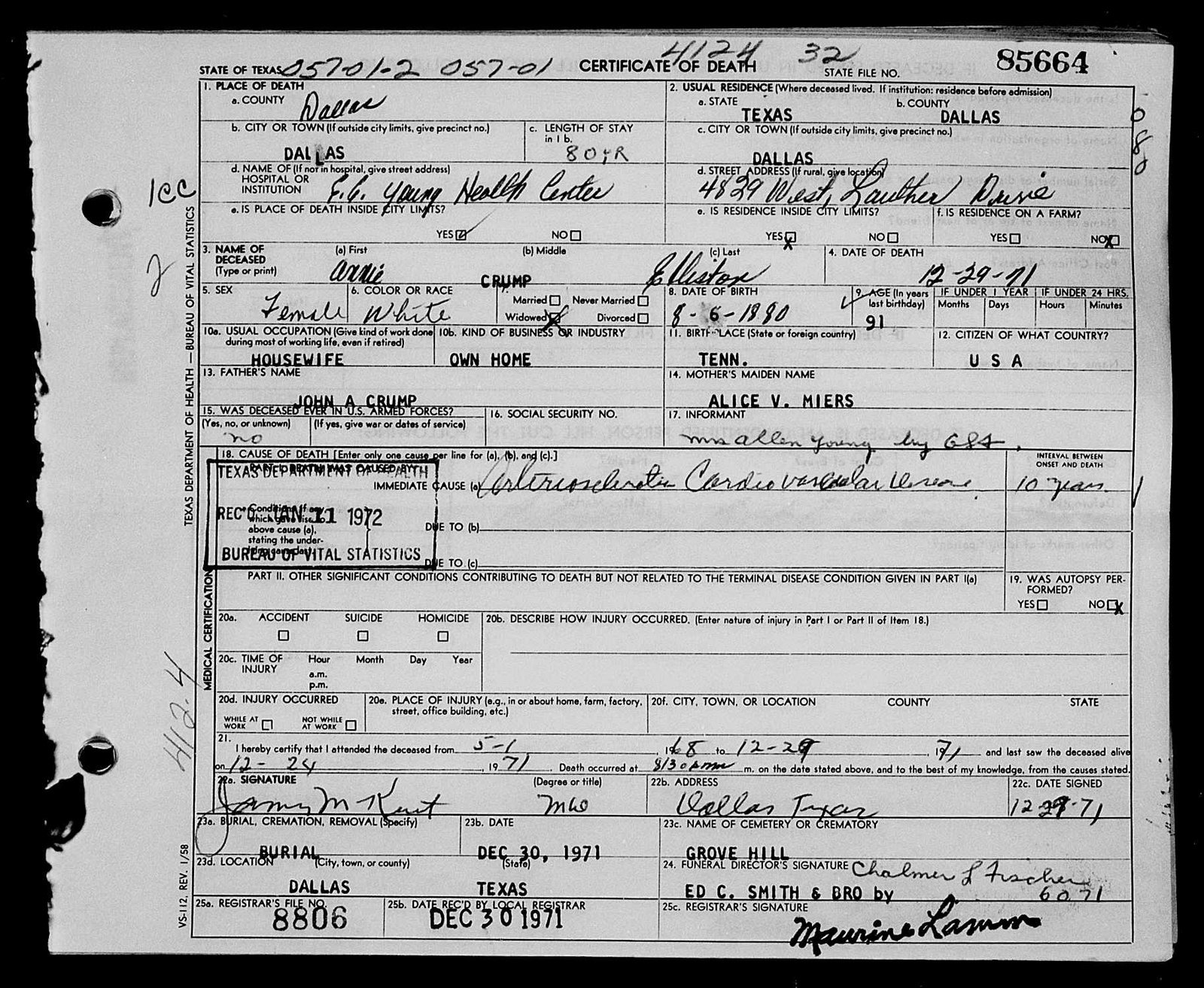 Surviving are his wife, Mrs. Annie Crump Elliston of Dallas, and a sister, Mrs.