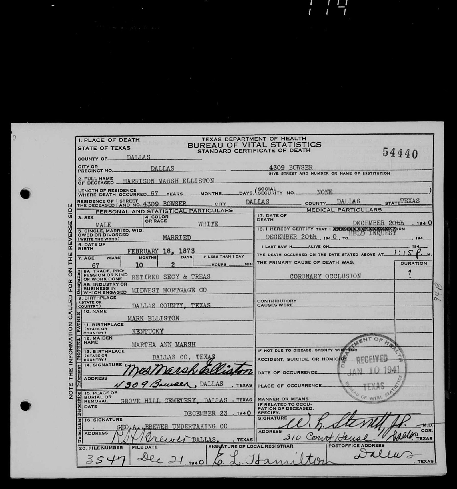 Dallas County Tax Assessor, died Friday at his home, 4309 Bowser. He had been