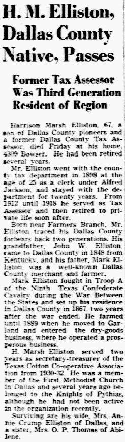Born near Farmers Branch, Mr. Elliston traced his Dallas County forbearers back