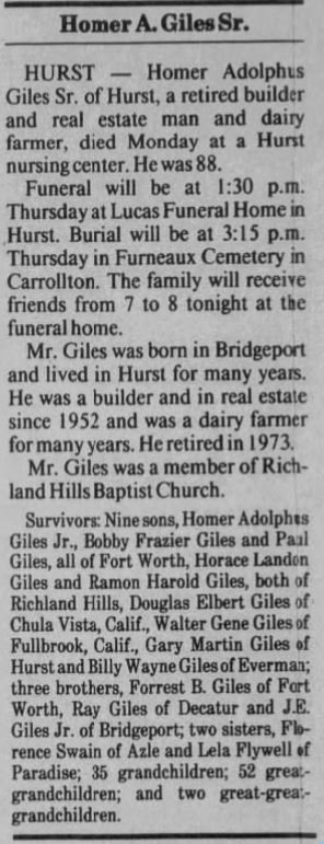 Survivors: Nine sons, Homer Adolpnus Giles Jr. Bobby Frazier Giles and Paul