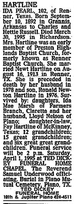 Hartline in 1976. Survived by: daughters, Ida Mae Marsh of Farmers Branch,