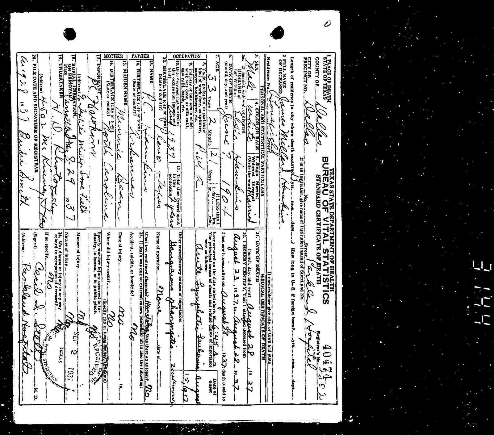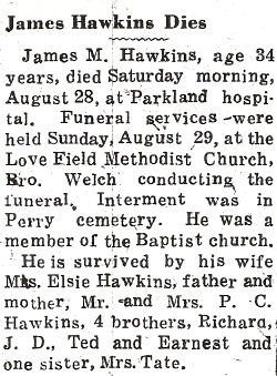 James M. Hawkins, age 34 years, died Saturday morning, August 28, at Parkland