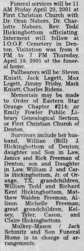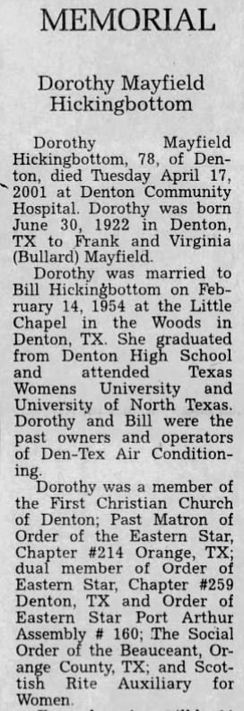 Mayfield Hickingbottom, 78, of Denton, died Tuesday, April 17, 2001, at