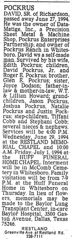 and owner of Pockrus Ranch in Whitesboro. David was a self-made man. Survived by