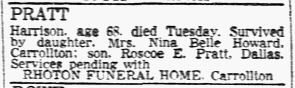 Carrollton; son, Roscoe E. Pratt, Dallas. Services Pending with RHOTON