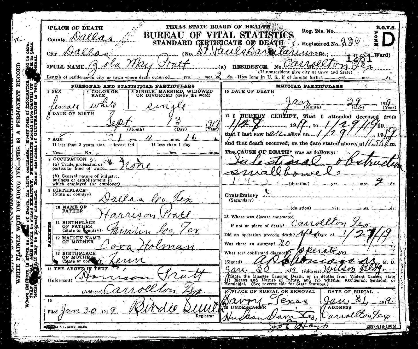 - Nina Belle (Pratt) Howard bur Perry Cemetery, Carrollton, Dallas