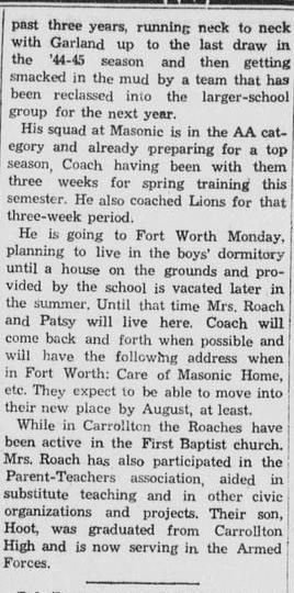 summer. Until that time Mrs. Roach and Patsy will live here. Coach