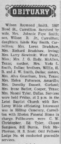 Wilson Raymond Smith, 1807 Hood St., Carrollton. Survived by wife, Mrs.
