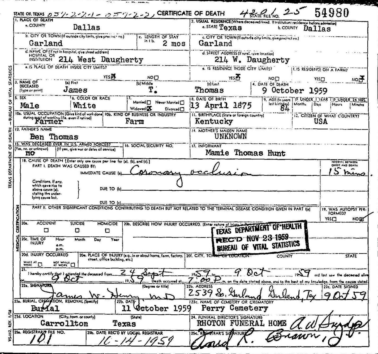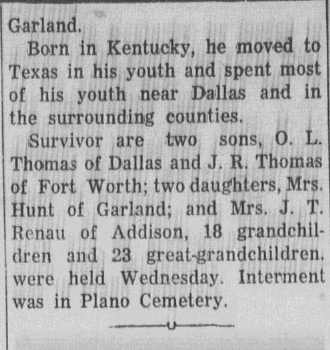 Mr. Thomas died at the home of his daughter, Mrs. R. L. Hunt, in Garland