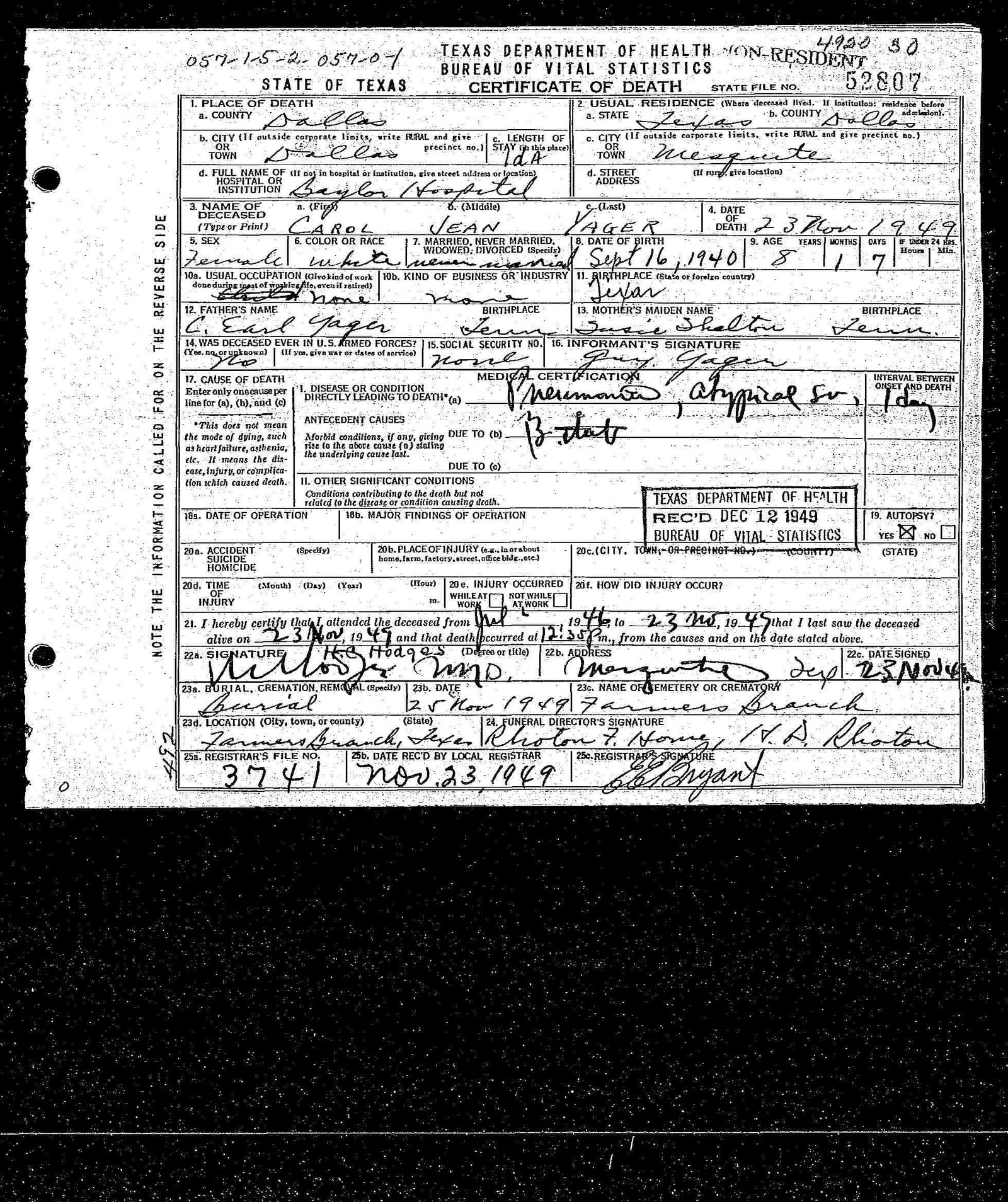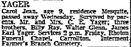 Carol Jean, age 9, residence, Mesquite, passed away Wednesday.