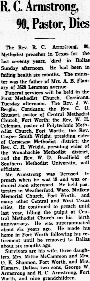 The Rev. R. C. Armstrong, 90, Methodist preacher in Texas for the last seventy