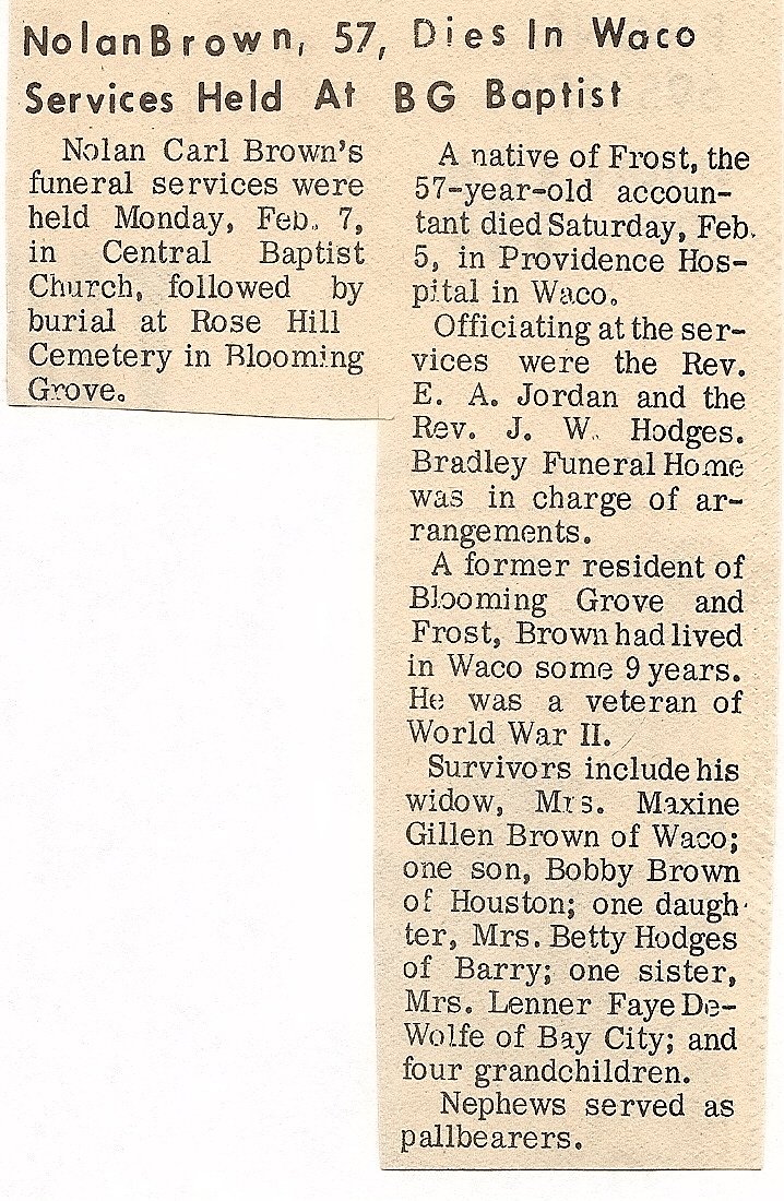 Survivors include his widow, Mrs. Maxine Gellen Brown of Waco; one son, Bobby