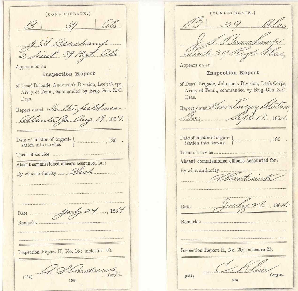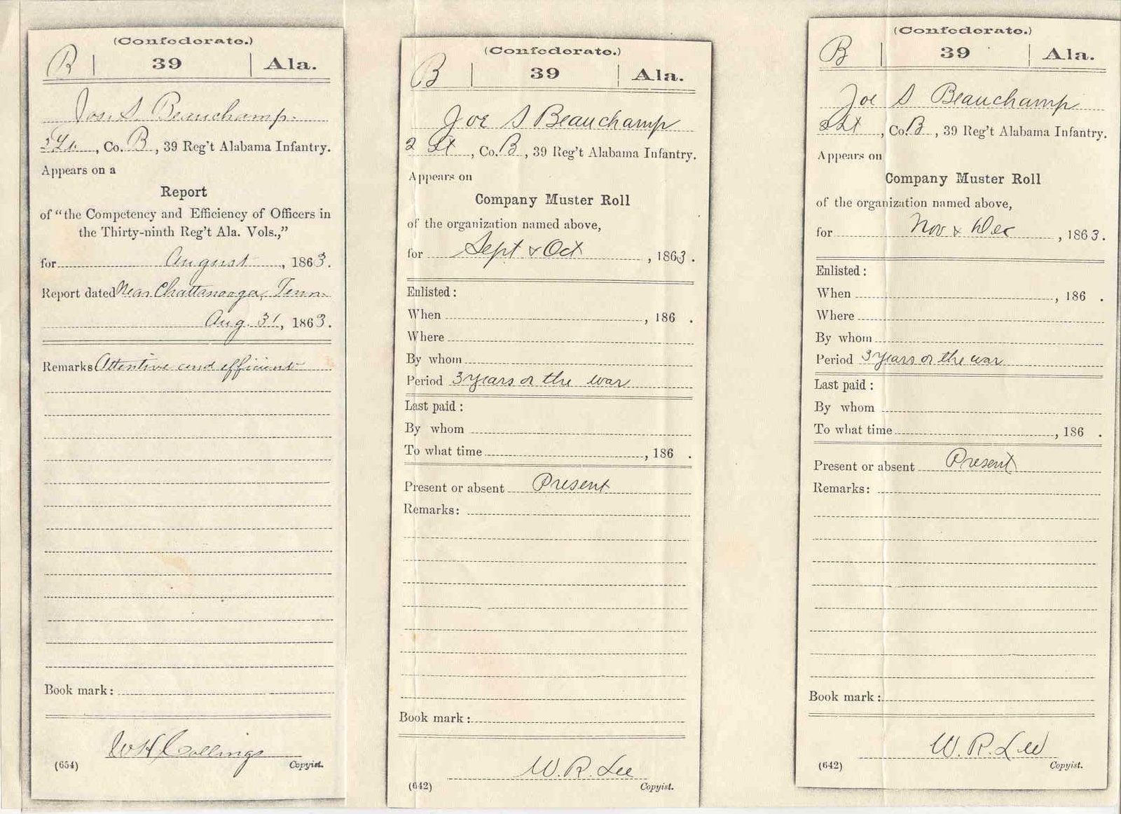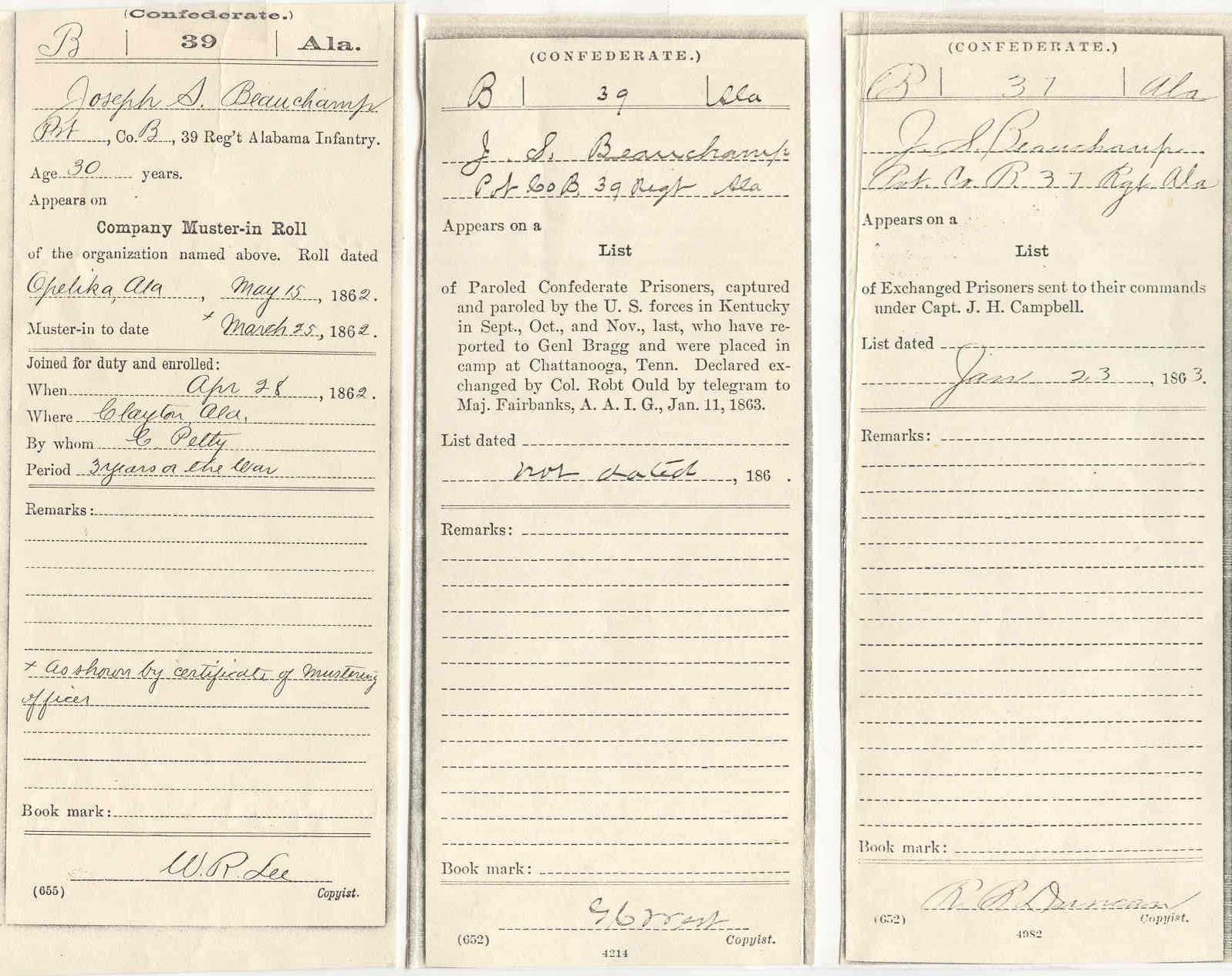 Muster Rolls, he Mustered in at Opelika, Alabama as a Private on March 25, 1862,