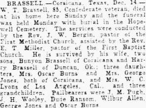 W. T. Brassell, 85, Confederate veteran, died at his home here Sunday and