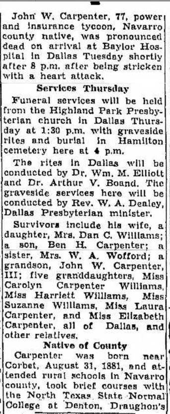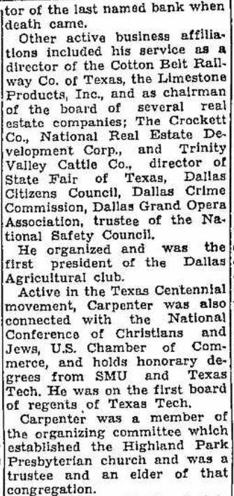 Dallas Historical Society and the Texas State Historical Association.qqv Carpenter Freeway in Dallas is named for him. On June 18, 1913, he married Flossie Belle Gardner of Palestine, Texas; they had three children. Carpenter was a Presbyterian and a Democrat. On June 16, 1959, he died at his home of a heart attack. He was buried in Corsicana. BIBLIOGRAPHY: Dallas Morning News, September 17, 1950, March 11, 1951, February 28, 1953, April 12, June 17, 1959, September 7, 1963, January 24, 1967. Who Was Who in America, Vol. 6.