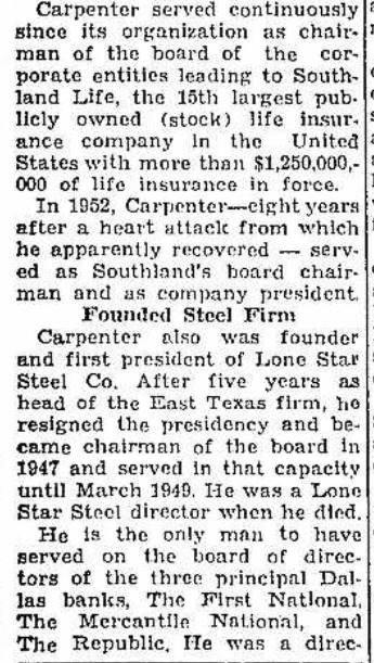 board member and chairman of the company's executive committee. From 1927 to 1947 he served as president and general manager of Texas Public Utilities Corporation, which ran Texas Electric Service Company as well as TP&L. In 1930 Carpenter organized Texas Security Life Insurance Company, which through various combinations and mergers became Southland Life Insurance Company and was, at the time of his death, the nation's fifteenth largest publicly owned life insurance company. Carpenter was the founder and first president of Lone Star Steel; this company's contribution to the development of East Texas earned
