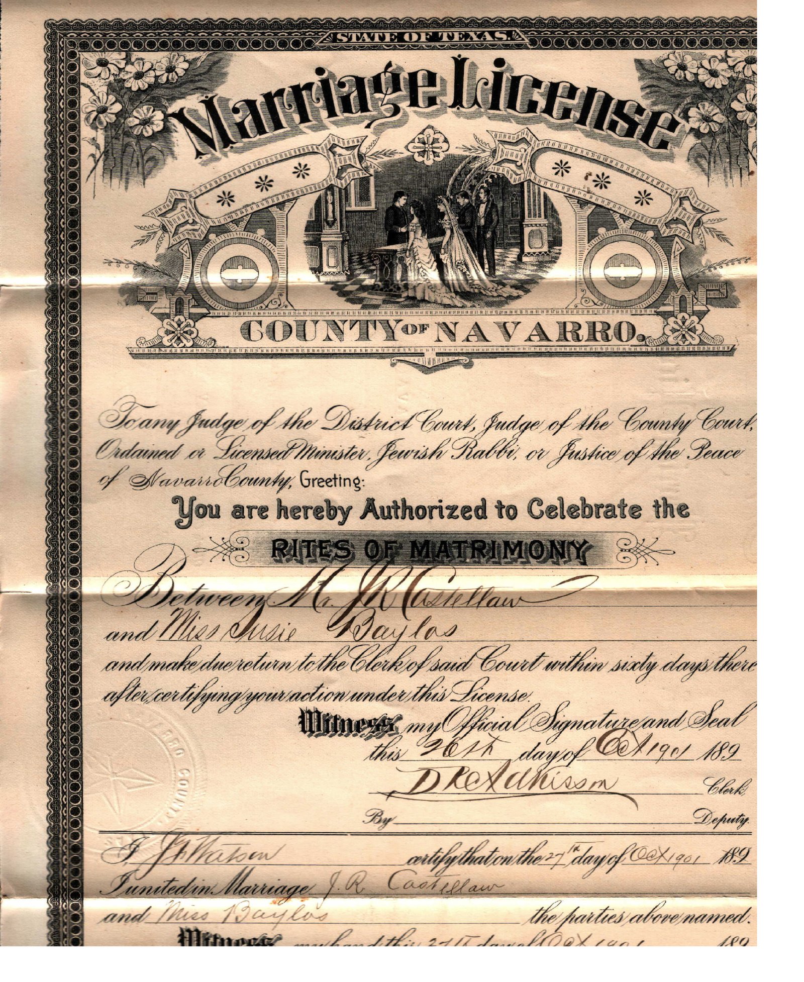 He married Susie Elizabeth Bayless in Navarro County, Texas. (see photo of marriage license). They are buried at the Campbell-Elrod Cemetery in Navarro Co., TX.Notes: