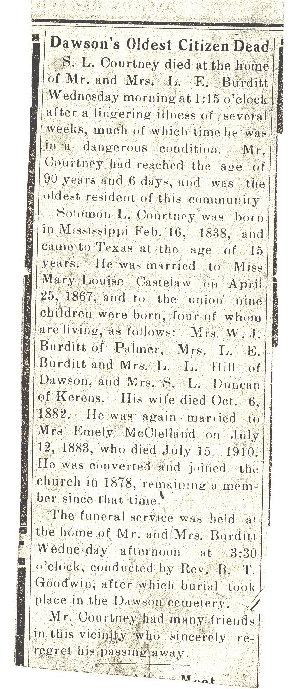 Emeline Courtney Burditt all buried in Dawson Cemetery as is Solomon L.).