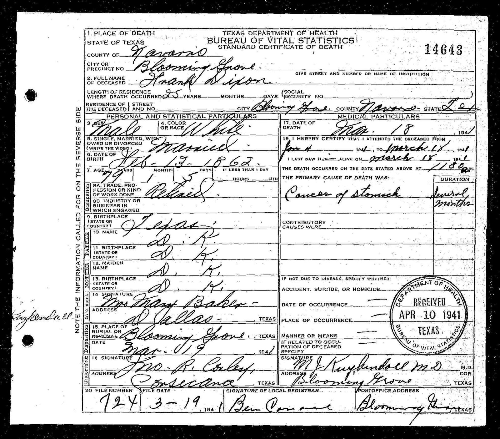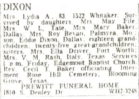 Dixon of Dallas; two sisters, Mrs. Ella Driver of Fort Worth and Mrs. V.