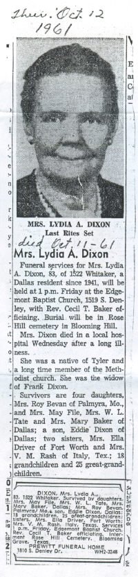 Mrs. Roy Bevan, Palmyra, Mo.; son, Eddie Dixon, Dallas, eighteen grandchildren,