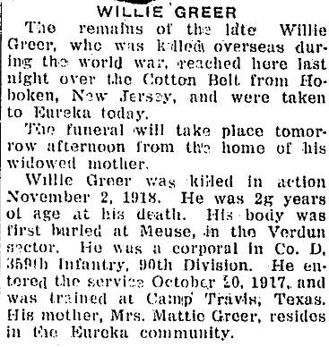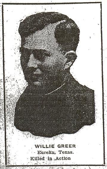 Willie Greer was killed in action November 2, 1918. He was 2g [sic] years of