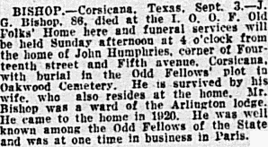 BISHOP - Corsicana, Texas. Sept. 3. - J. G. Bishop, 86, died at the I. O. O. F.
