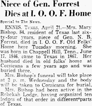 Niece of Gen. Forrest Dies at I.O.O.F. Home
