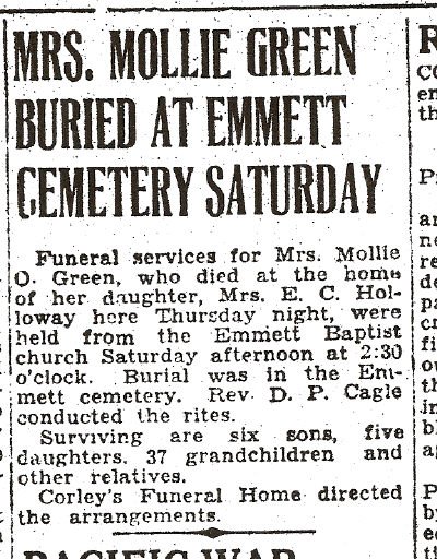 Mr. Mollie O. Green died Thursday night at the home of her daughter, Mrs. E. C. Holloway on West Sixth avenue. Funeral services will be held Saturday afternoon at 2:30 from the Emmett Baptist church with Rev. D. P. Cagle conducting the rites. Burial will be in the Emmett cemetery.