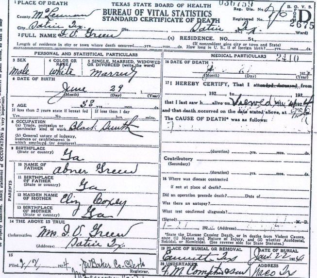 Isaac Vanvert Green on Dec 12, 1896 in Navarro Co., TX. Isaac died in on