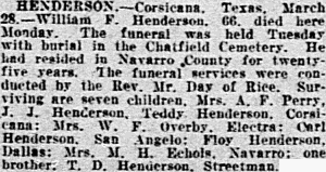 March 28, 1928 HENDERSON. Corsicana, Texas, March 28. - William F. Henderson, 66, died here Monday. The funeral was held Tuesday with burial in the