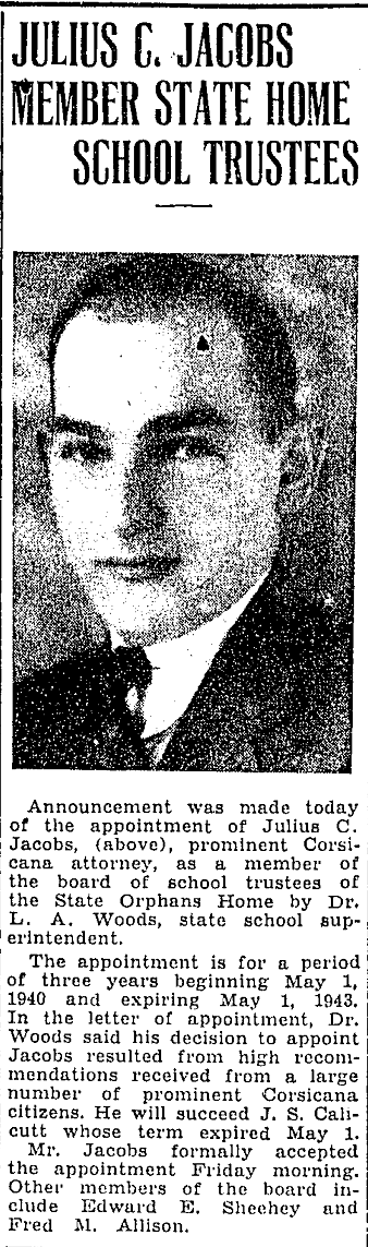 of the appointment of Julius C. Jacobs, (above), prominent Corsicana attorney,