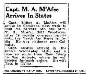 Milton A. McAfee will arrive in Corsicana next week to visit his