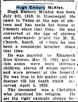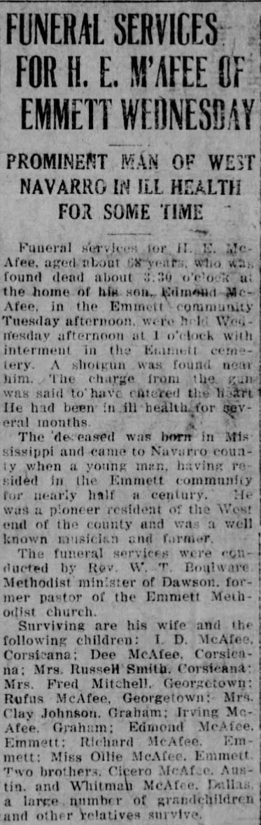2 Edmond Thomas McAfee b: 16 May 1899 in Frost, Navarro Co., TX