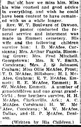 Burial: Dresden Cemetery, Navarro Co., TX; (Obituary)