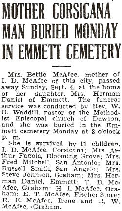 b: 1889 d: 23 Sep 1939 in Young Co., TX m: 28 Dec 1915 in Navarro Co., TX