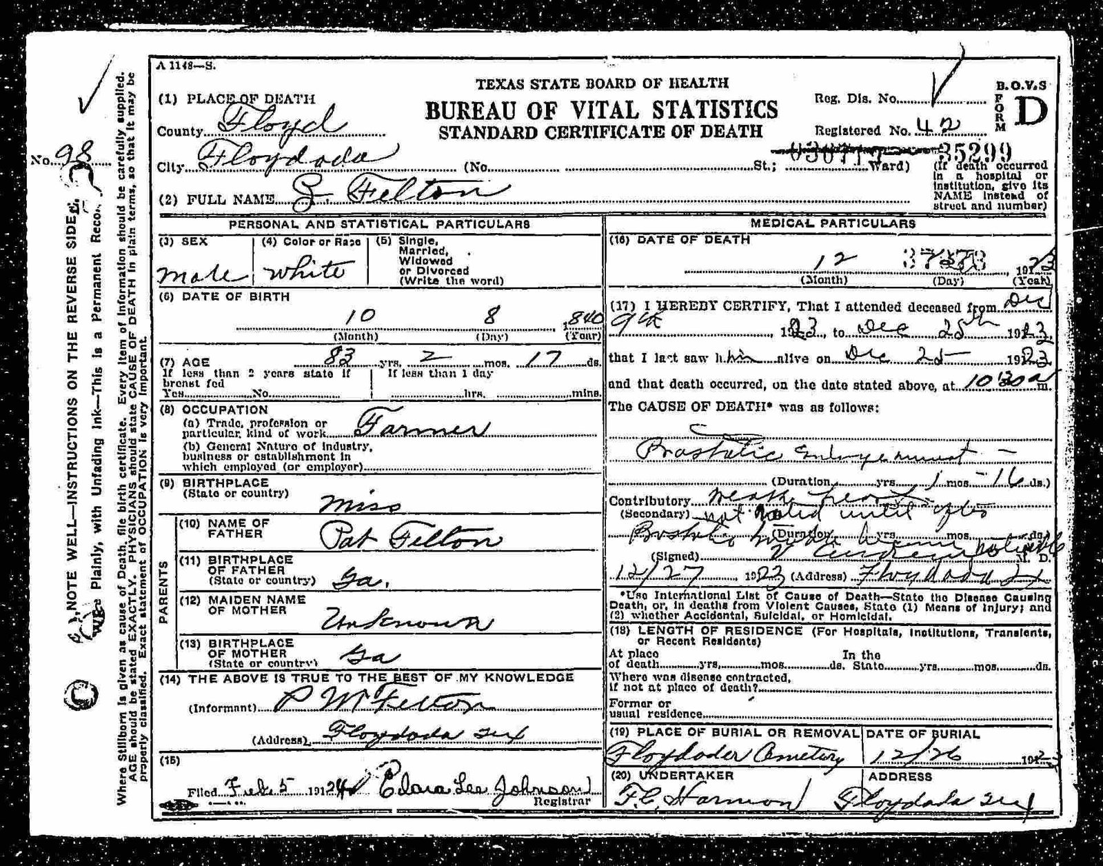 Felton b: October 3m 1840 in Sumter Co., AL d: 25 Dec 1923 in Floydada,