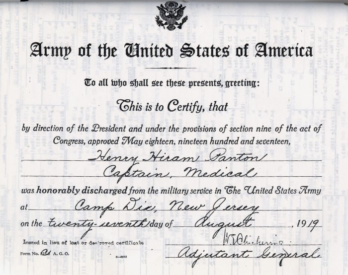 Henry Hiram Panton, born 14 March 1882 in Clay Center, Kansas. Received Honorable Discharge as Captain, Medical, at Camp Dix, New Jersey on August 27, 1919. Henry died 14 May 1941 in