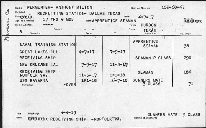 Purdon, Chief Gunner's Mate, U. S. Navy, entered the service of the U. S. Navy, April 7, 1917. Trained at the Great Lakes Training Station and at New Orleans. Went to France and England in the transport service. At time this data was gathered he was still
