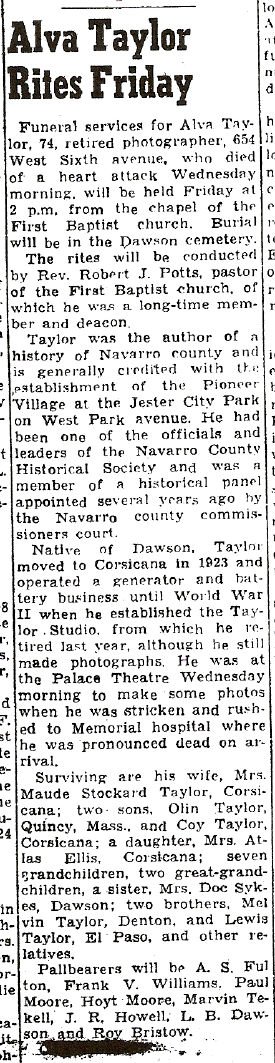 Native of Dawson, Taylor moved to Corsicana in 1923 and operated a generator and