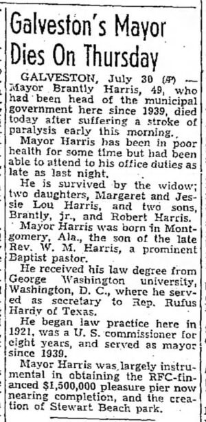 BRANTLEY HARRIS, MAYOR OF GALVESTON DIED ON