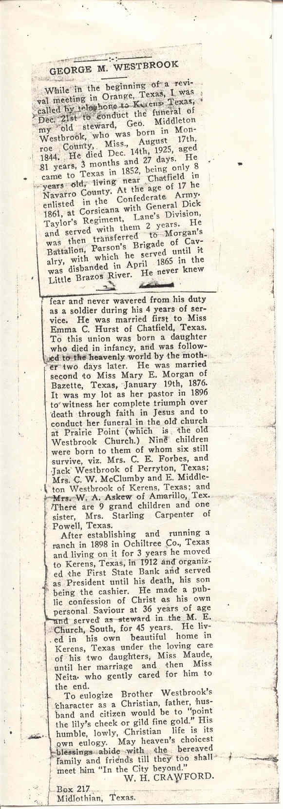 G. M. WESTBROOK HAD LIVED IN KERENS COMMUNITY MANY YEARS