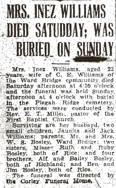 and Letha Juanita Willliams. Inez died 3 February 1934 in