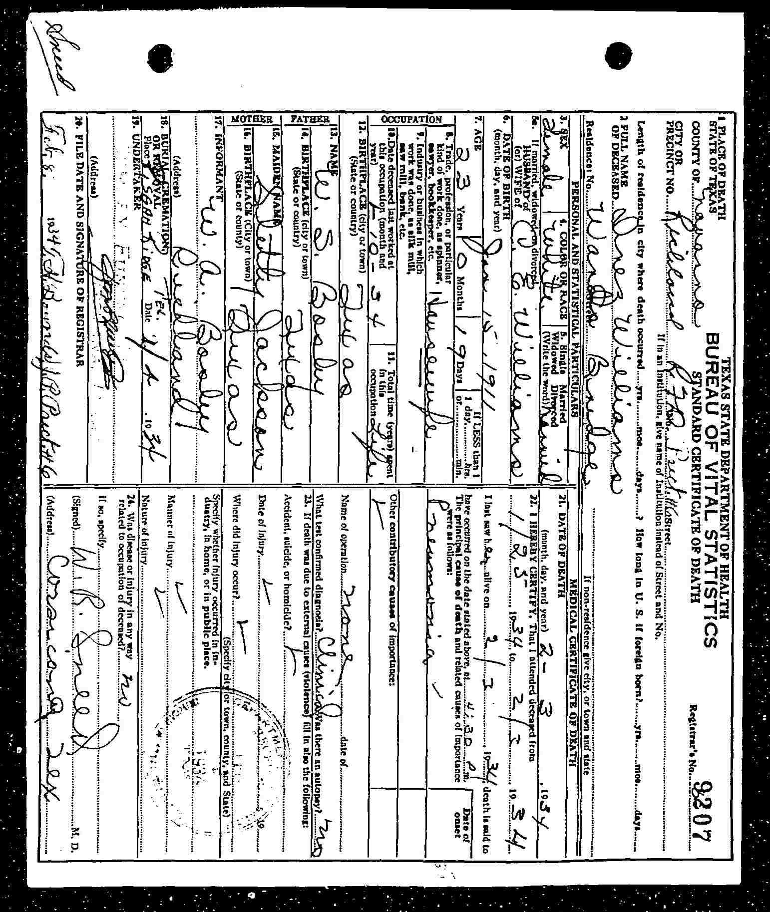 Navarro County, Texas and died two days later on 9 September 1935.